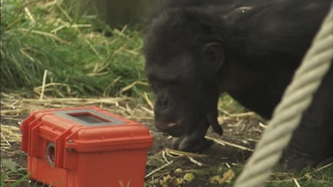 Emma tests out the durability of the case we were hoping to make into the Chimpcam (chimp-proof camera).