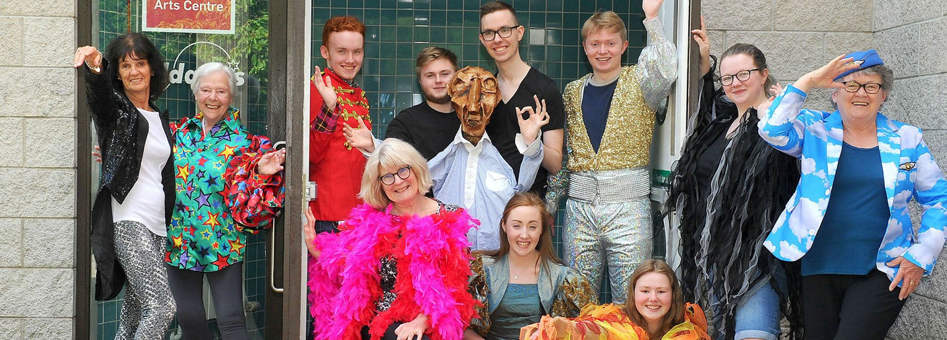 Budding actors from Macrobert Youth Theatre Company posed with members of the M-Dance Plus group, in a variety of costumes outside a new, temporary entrance - which will replace the original main door to the Arts Centre and University atrium until the completion of the project – expected by academic year 2020/2021.