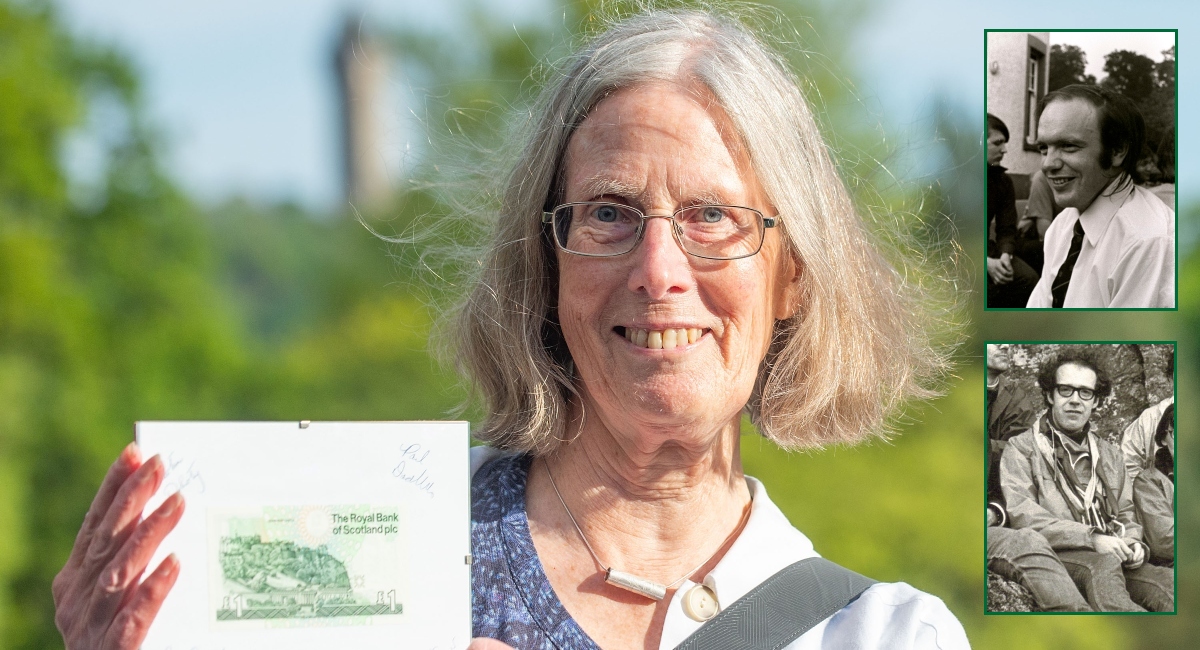 Terry Macdonald, widow of Ranald Macdonald (inset top), poses with the £1 note Ranald received on his retirement, in recognition of his contribution to the establishment of the Dumyat Hill Race. John Evans, who won the bet in 1971, is inset below.